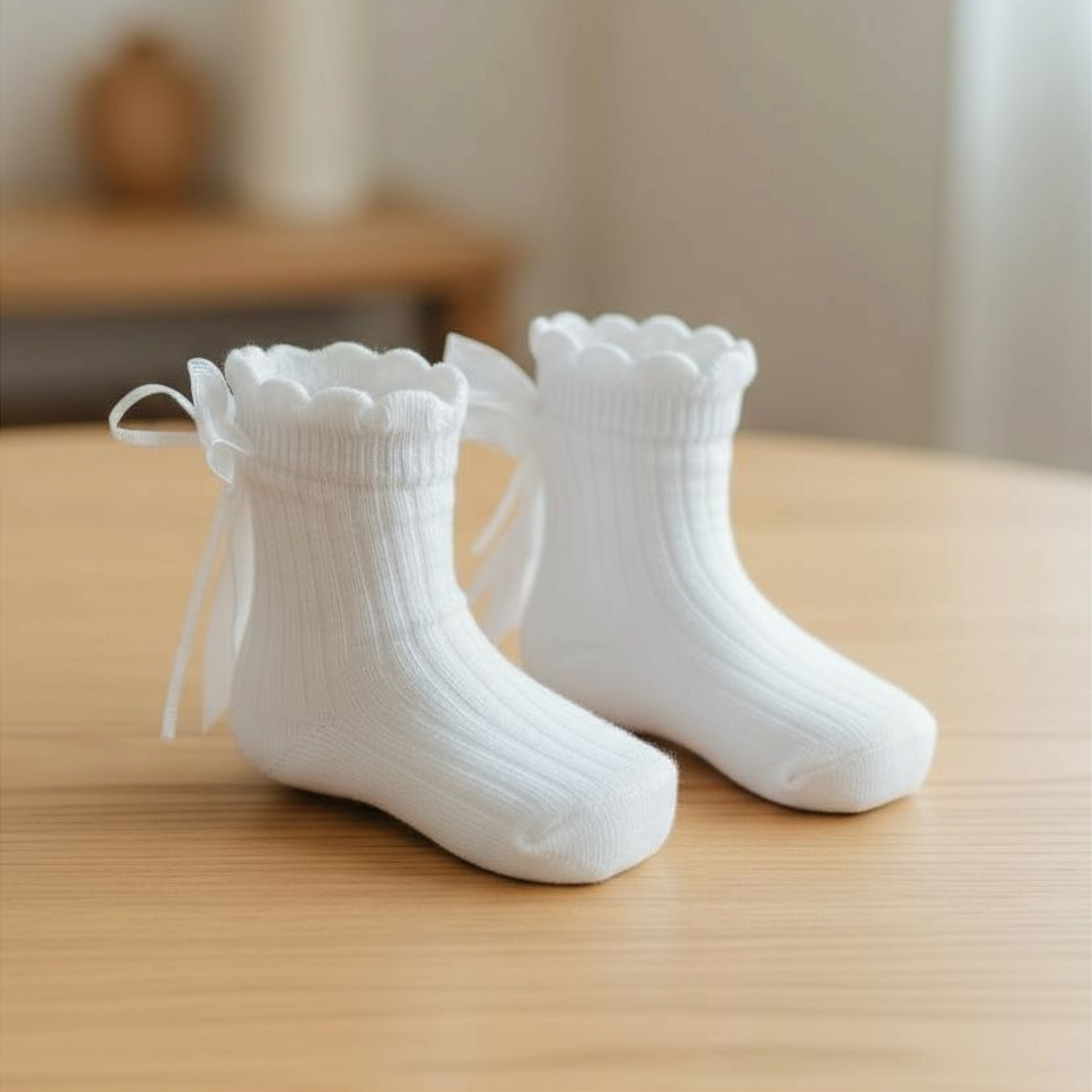 Meia Infantil de Algodão Cano Médio Canelada com Laço e Voal