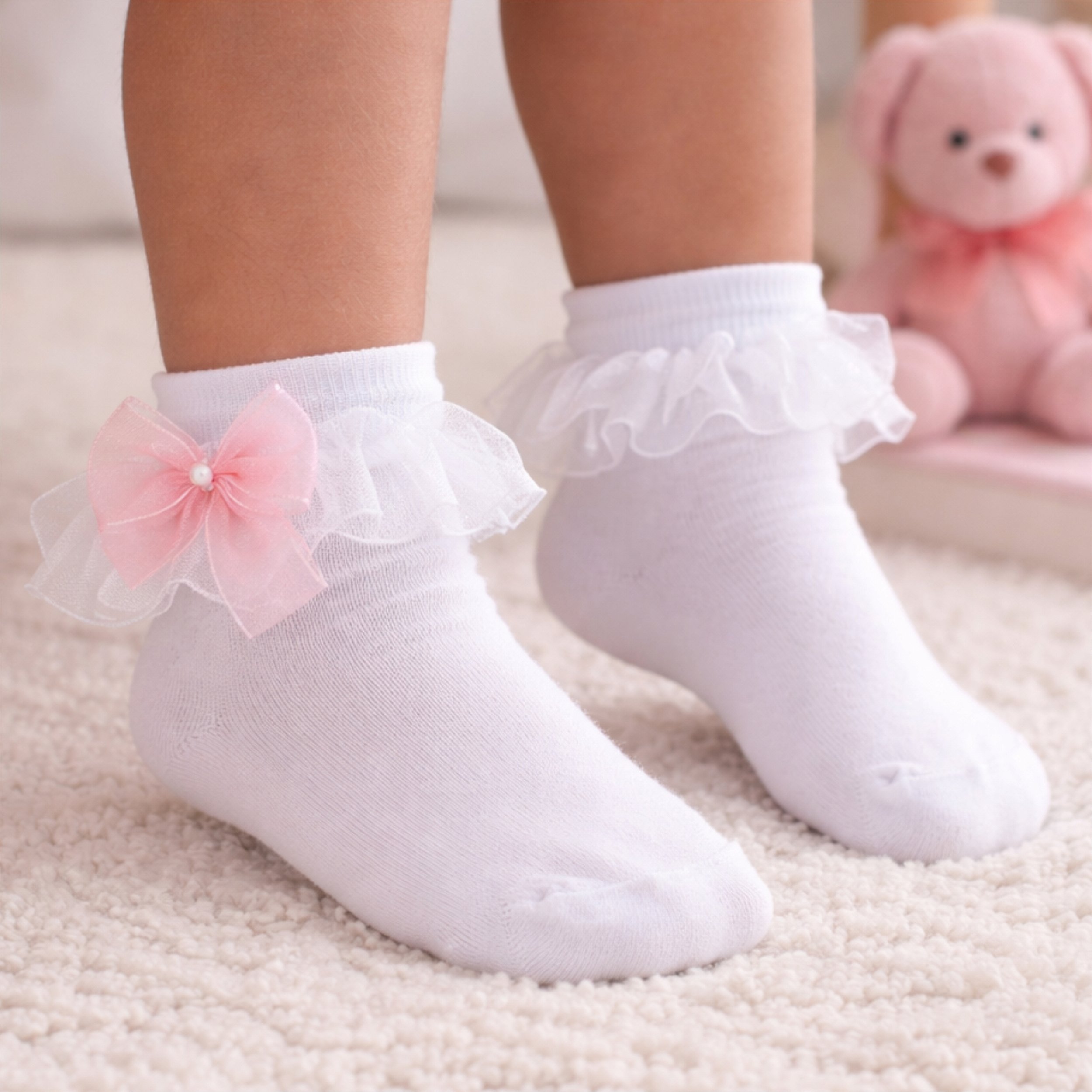 Essa meia superdelicada possui renda de voal e laço. Indispensável para compor os looks das pequenas!